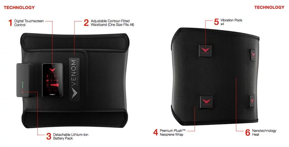 The heat itself is distributed via embedded nanotechnology, with four evenly spaced vibration pods providing a comfortable deep massage. For regular use, simply wrap the Venom around the lower back area (One Size Fits All), attaching the strap snugly so that the vibration pods are centered on the back. Then, select your desired settings, press START, and get a precision pre or post-workout massage while on the go.